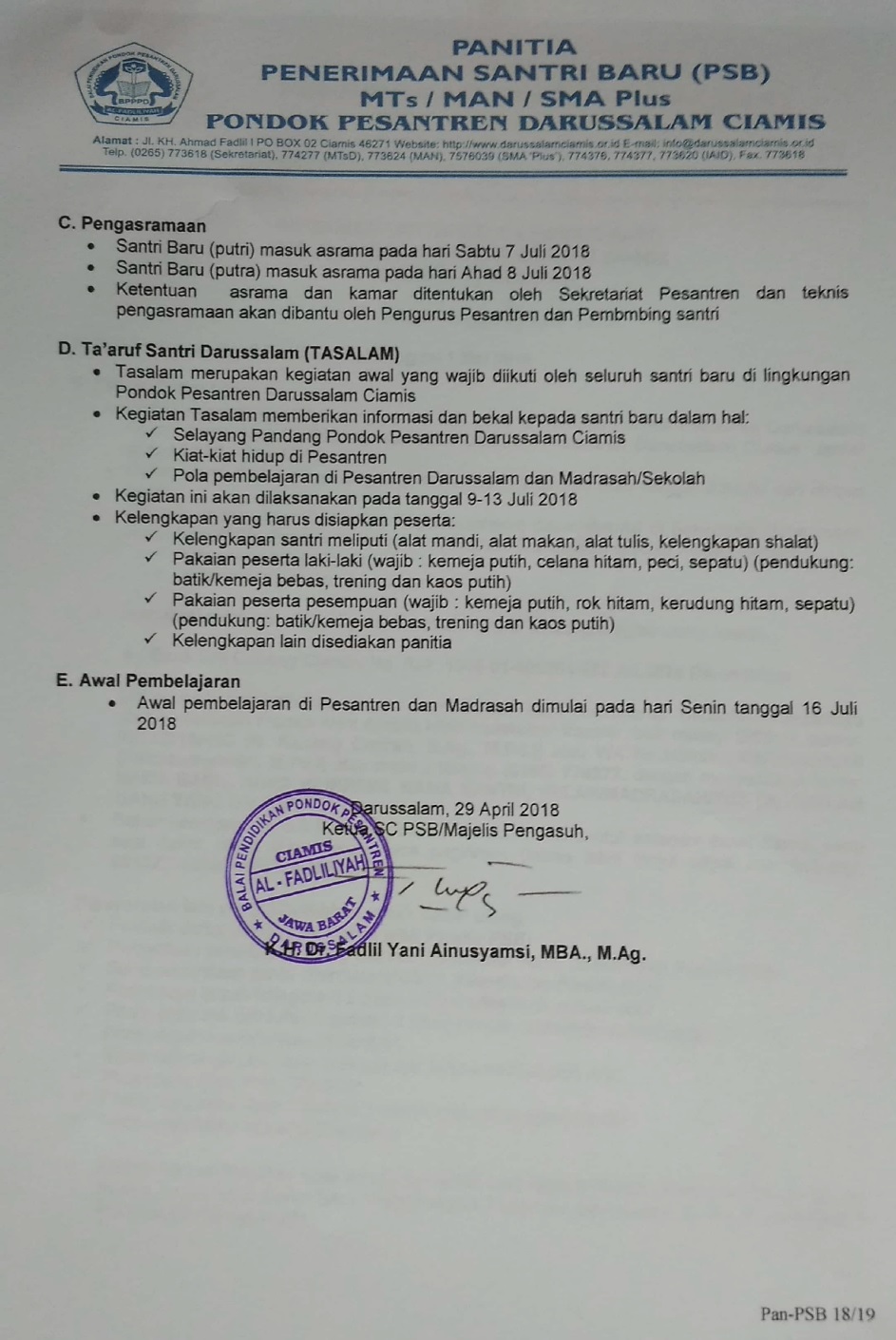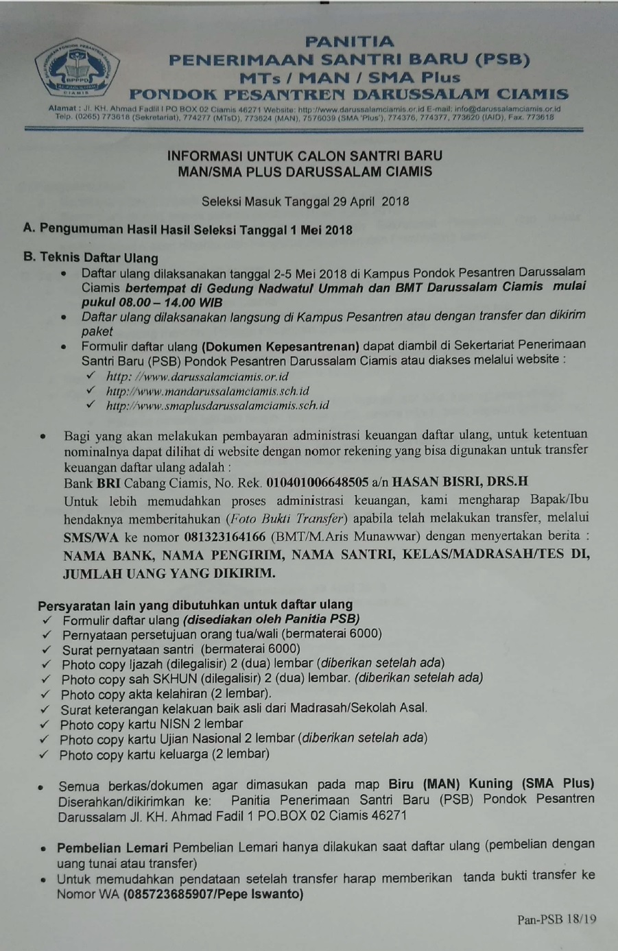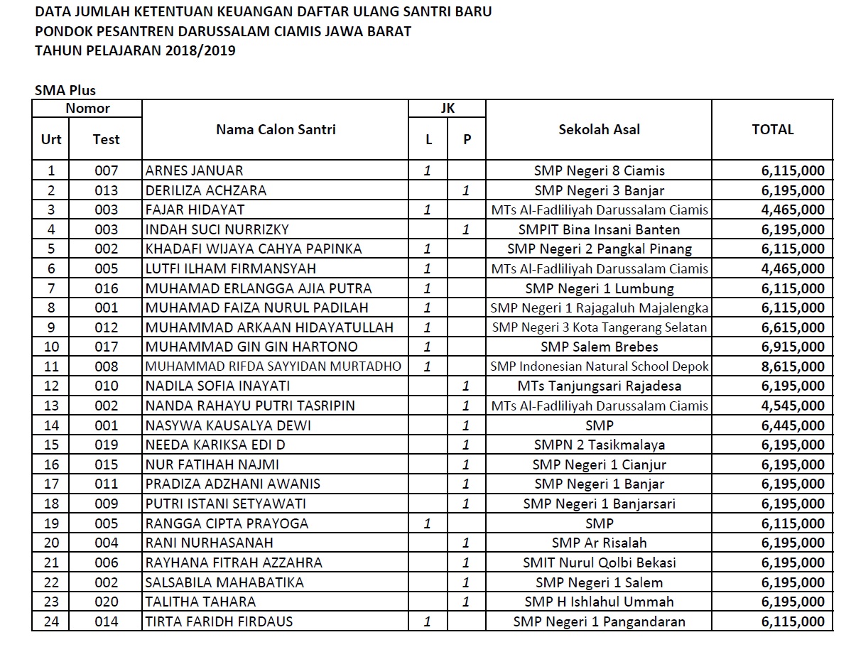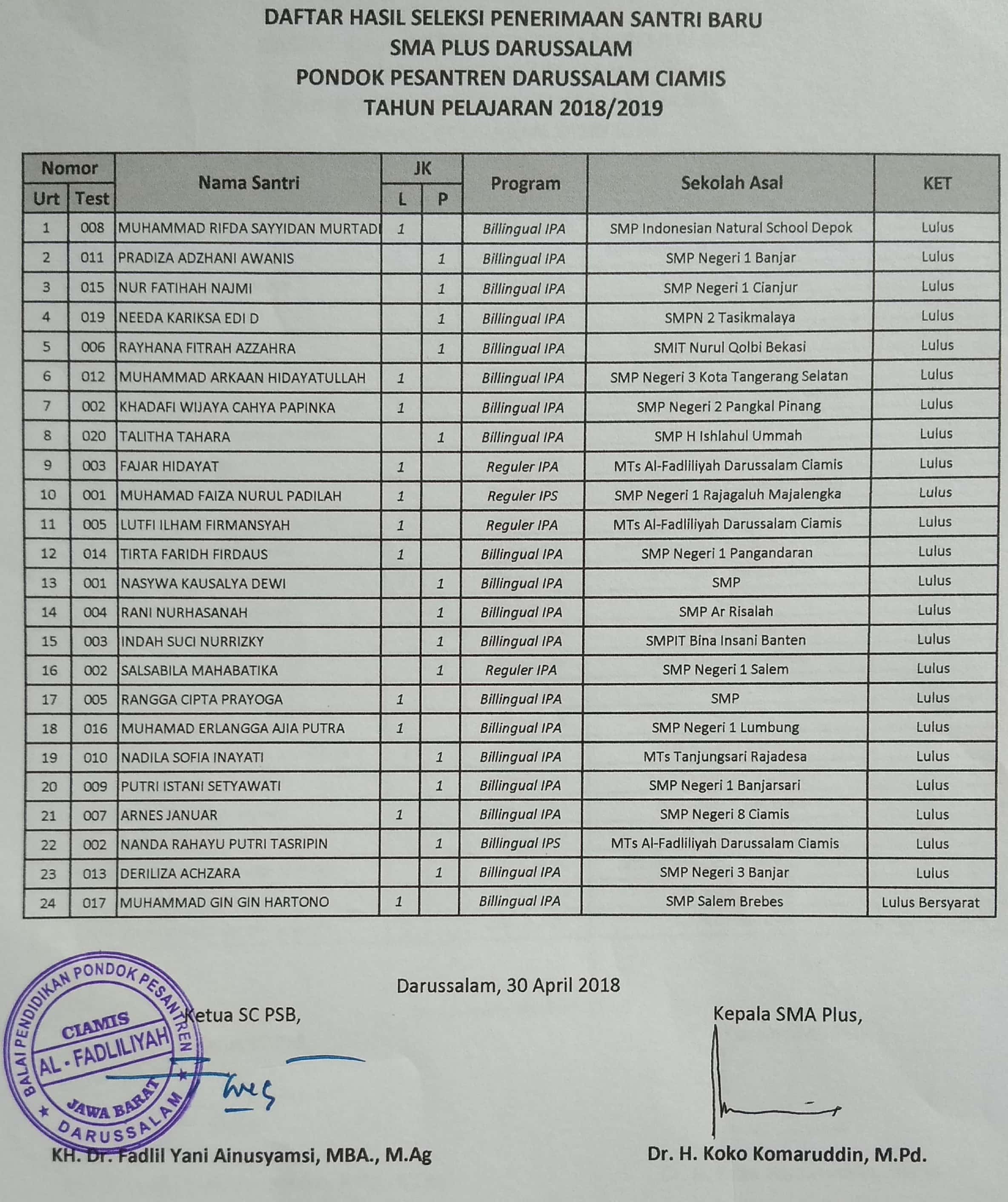 Pengumuman Hasil Seleksi Masuk SMA Plus Darussalam Tahun Pelajaran 2018/2019